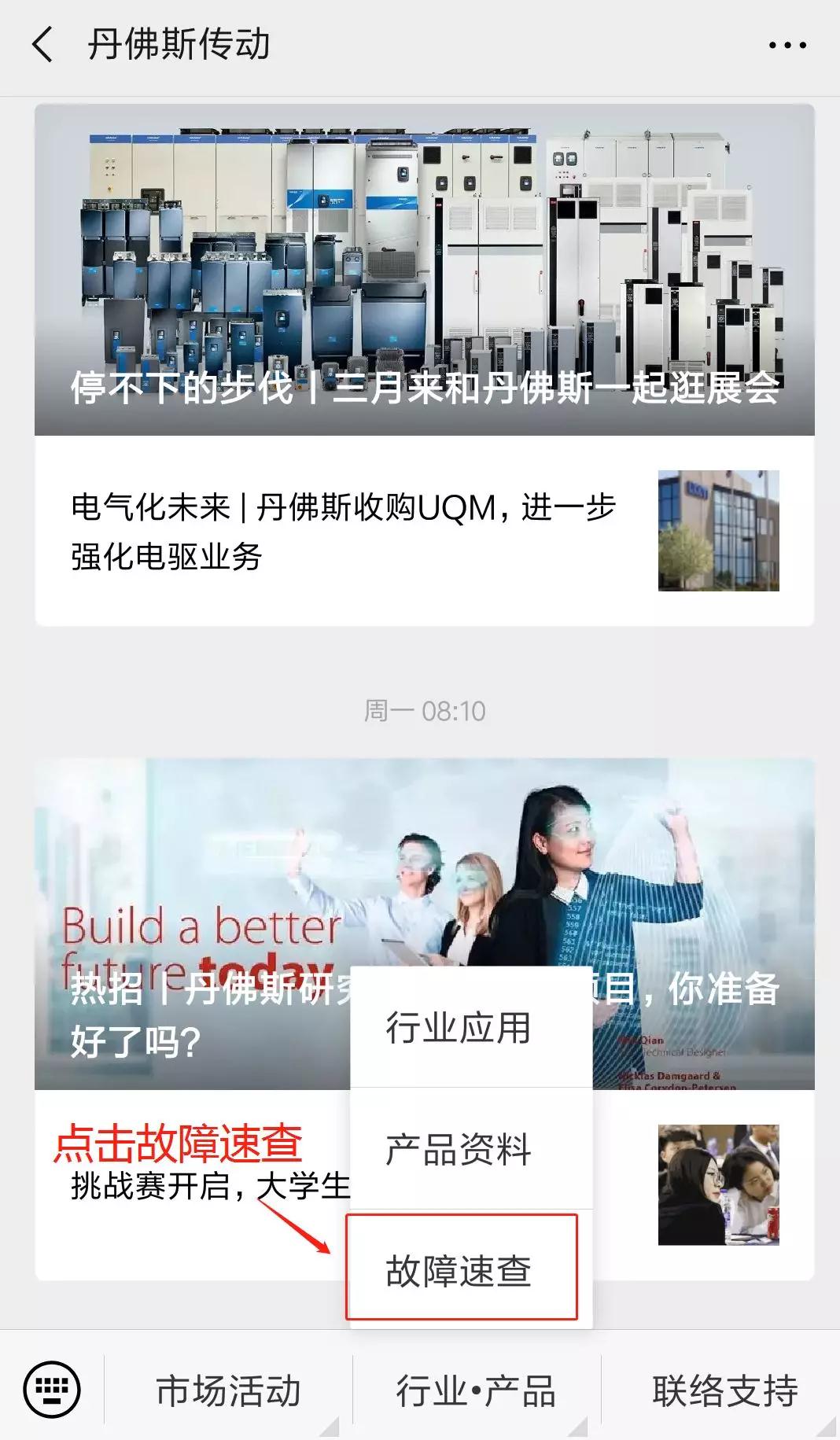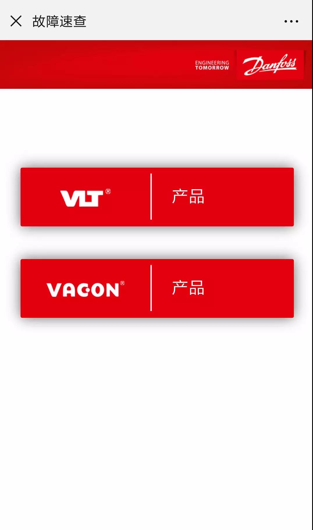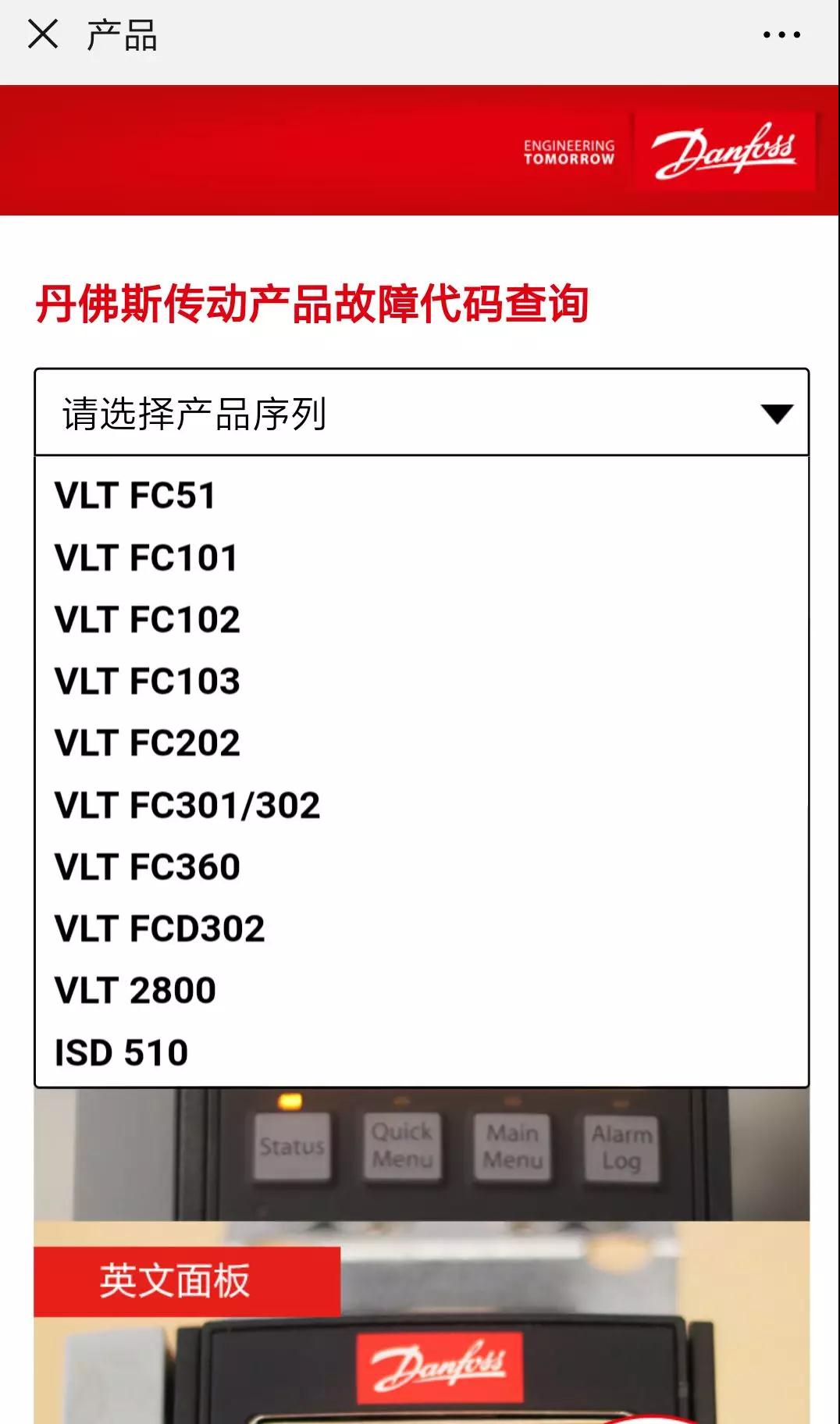 1.在丹佛斯傳動(dòng)公眾號(hào)菜單欄,點(diǎn)擊【行業(yè)·產(chǎn)品】,選擇“故障速查”,即可進(jìn)入故障速查首頁(yè)。